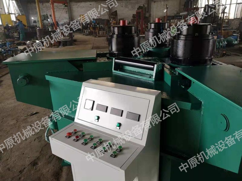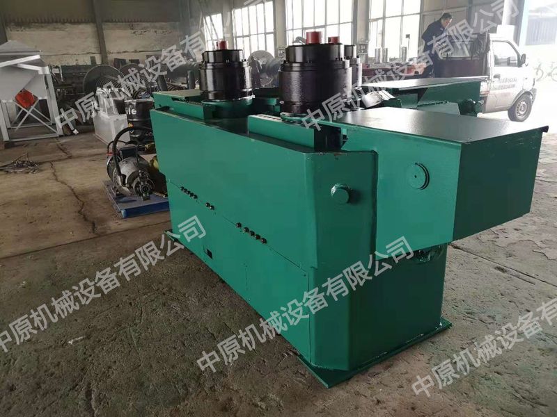 該機(jī)為叁輥型材卷圓機(jī),集機(jī)電一體。電機(jī)輸出的較高轉(zhuǎn)速通過(guò)傳動(dòng)裝置(聯(lián)軸器,液壓馬達(dá),液壓油缸,齒輪等)轉(zhuǎn)換成所需的大扭矩低轉(zhuǎn)速,帶動(dòng)兩主動(dòng)輥實(shí)現(xiàn)旋轉(zhuǎn)運(yùn)動(dòng),為型材行走提供扭矩。兩個(gè)主動(dòng)輥中心距可調(diào),被動(dòng)輥通過(guò)液壓油缸前進(jìn)、后退實(shí)現(xiàn)位移,來(lái)控制直徑大小。三個(gè)工作輥成等腰三角形分布,通過(guò)調(diào)整移動(dòng)輥實(shí)現(xiàn)這三個(gè)點(diǎn)形成的弧線達(dá)到所需彎曲半徑,借助被動(dòng)輥的壓緊及兩主動(dòng)輥的旋轉(zhuǎn)運(yùn)動(dòng),使型材經(jīng)過(guò)多次連續(xù)彎曲,產(chǎn)生永久性塑性變形,用于常溫狀態(tài)下將型材卷制成圓形,弧形等工件。微信圖片_20180727095250